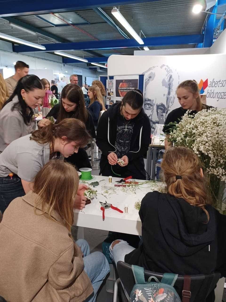Besonders gefragt waren die Mitmachangebote der jeweiligen Profilfächer. Gemeinsam mit Auszubildenden der Floristik konnten Besucher und Besucherinnen beispielsweise individuelle Blumenschmuckstücke gestalten und direkt mitnehmen. Große Aufmerksamkeit fanden zudem VR-Brillen, mit denen Messegäste Einblicke in die Berufswelt der Pflege sowie der Erzieherinnen und Erzieher gewinnen konnten. Für beide Bereiche standen entsprechende Filme zur Verfügung, die typische Situationen des Berufsalltags realitätsnah und anschaulich vermittelten.